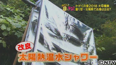 気になる装置は、黒いホースに水を入れ太陽熱で温めるのは変わってませんが、改良ポイントが2つ。1つ目は、ビニールシートで温室効果、二つ目は反射膜で太陽熱を最大限利用すること。理論上、冬場でも60度のお湯が作れる装置。今年こそお湯は出るのか?
