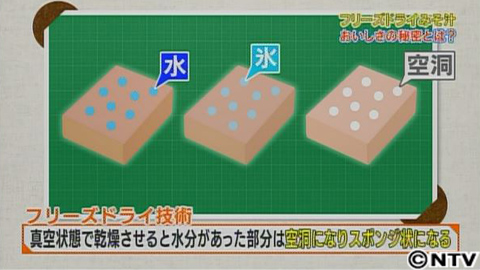そして、ここからが見所。いよいよフリーズドライの工程です。フリーズドライ技術のポイントは水分。凍らせる前、みそ汁や具の水分は水で存在しています。凍らせると、みそ汁や具の水分は氷に変化します。そして、真空状態で乾燥させると、水分がそのまま抜けるので空洞ができ、スポンジ状になるんです。