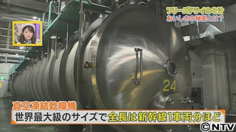 続いて、凍ったみそ汁を乾燥させるのが、真空にして、凍らせたまま乾かす、乾燥機です。24時間かけて氷の塊をクッキーのように乾かしていく設備です。こちらの真空凍結乾燥機は、世界最大級の大きさで、全長はなんと新幹線1車両分ほどもあるんです。