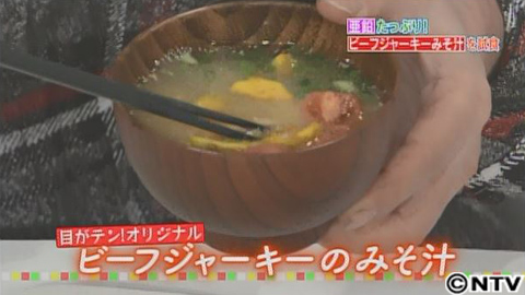 この道のプロも作ったことがないというビーフジャーキーのみそ汁。果たして作れるのか?まずは、みそ汁を試作。具材の大きさなど試行錯誤しながら、一食ずつ型枠に入れていきます。今回の難題はかぼちゃの皮の部分と、ビーフジャーキーがいかに、お湯をかけて戻りがよく出るかということ。何度か試作を繰り返し、改良を続けた結果…目がテンオリジナル!フリーズドライ健康みそ汁が完成!スタジオで試食した所さんも、魔法と大絶賛でした。