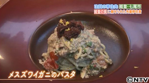 多くの料理人が訪ねてくる高農園(たかのうえん)にこの日もある料理人が訪れていました。ハウスの中の雑草を熱心に物色するのは、先輩移住者のイタリアン料理人・平田さん。2年前、東京から移住し、七尾市でお店を開きました。そして実はこの方…今年開かれたパスタ・ワールドカップに日本代表として出場した、日本イタリア料理界の若きエースなんです。大会では、能登の食材を使った独創的な一皿で注目を集めました。せっかくなので、平田さんのお店にお邪魔することに。お店に着くなり、調理を始める平田さん。出来上がったのは・・・能登の旬、ズワイガニの卵と能登島の野菜を使ったパスタ。