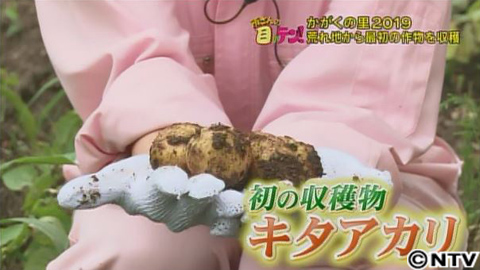 そんな大失敗がありつつもほとんどのジャガイモはすくすくと育ち、迎えた7月。深く、くわを入れると中から、かがくの里、初めての実りキタアカリ!