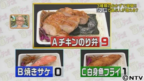 それでは実験。みなさん次々とAのチキンのり弁を選び、結果は、なんと10人中9人がAのチキンのり弁を選びました。