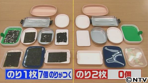 実験の結果、海苔1枚のお弁当は10個中7個が蓋にくっつき海苔2枚では、なんと1つも蓋にくっつかなかったんです!