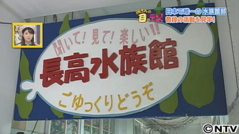 平日の学校にお邪魔してみると、いきなり水槽発見!そして、ミズクラゲが泳いでいます!さらに廊下を進むと、そこには『長高水族館』の看板が!