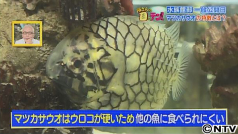 1年生の濱崎くんが受け持つ水槽には、マツカサウオ。夜になると、緑っぽく、光るといいます。夜のマツカサウオを見てみるとホタルのように小さな光が。これは下顎の一部が光っているんです。下顎に発光バクテリアを溜め込んでいるため、光って見えるんだそう。その理由は、プランクトンやエサを寄せ付けたりするため。逆に食べられたりしないか不安になりますが、マツカサウオはウロコが硬いため他の魚に食べられにくいんです。