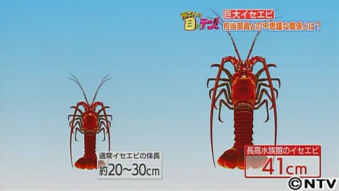 続いて、イセエビ担当の町田くん。実はこのイセエビは、漁師さんからいただいたもの。ここまでに大きいのは珍しいため、地元の新聞にも掲載されたといいます。通常イセエビの体長は20~30cmほどですが、このイセエビは2倍ほどもある41cm。