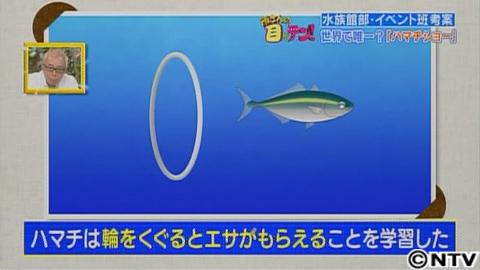 これはイベント班の3年生、冨永くんが考案したもの。投げたエサに反応するハマチの姿を見て、それを利用すれば、輪くぐりができるんじゃないかと考えたとの事。実は、魚には種類に関係なくある程度学習能力があります。このハマチの場合は、輪をくぐるとエサがもらえる事を学習したため、輪くぐりができるようになったと考えられます。