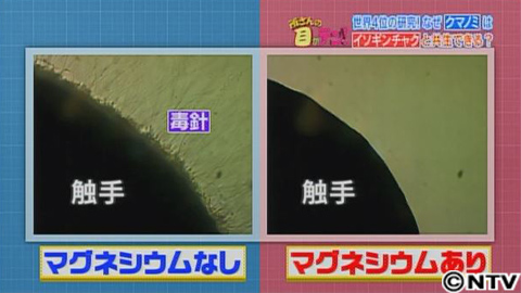 まずチーム・ニモが行ったのは、ハタゴイソギンチャクの触手をさまざまな溶液に浸して、毒針の発射を観察する事でした。そしてそこから、マグネシウムがあると、毒針が発射されにくくなることを発見したんです。