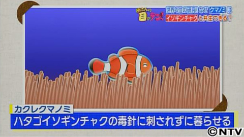 夏帆さんの研究は、「カクレクマノミはどうしてイソギンチャクに刺されないのか?」。初代チーム・ニモは、映画ファインディング・ニモで有名になった"カクレクマノミ"と"ハタゴイソギンチャク"の関係を研究していました。実は、イソギンチャクは毒を持つため、共生できる魚はとても珍しいんです。イソギンチャクに魚が近寄り、その触手に触れると、毒針が発射され魚はマヒ。イソギンチャクはその魚を捕らえ、エサとします。では、なぜカクレクマノミはハタゴイソギンチャクに刺されることなく、一緒に暮らすことができるのでしょうか?