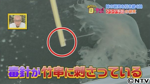 用意するのはクラゲと、竹串。まず比較として、何も塗っていない竹串をクラゲの触手につけてみます。すると、触手が竹串にくっついていることが分かります。これは毒針が竹串に刺さったからなんです。