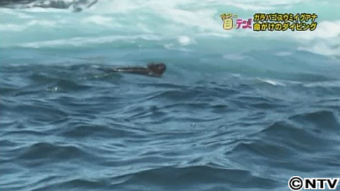 海に適応し、繁栄することができたんです。とはいえ、海で生きるのも楽ではありません。外の温度で体温が変わってしまう変温動物なので、太陽の光を浴びて体温が上がってからでないと、冷たい海には入れないんです。体温が上がると海へ。しっぽを上手に使って泳ぎます。しかし、4つの海流が集まるガラパゴス周辺の海は、流れが強烈。激しい流れの中で潜って岩にしがみつき、息を止めていられる10分ほどの間に海藻を食べます。カメラマンが体勢を崩すほどの水流でも、ウミイグアナびくともせず、鋭い爪で岩に張り付いています。しかし、時には冷たい海に体温を奪われ、体が動かなくなり溺れ死ぬこともあるそうです。ウミイグアナは海で豊富な食料を手に入れた代わりに、常に命がけのダイビングをしていたんです。