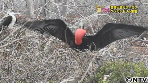 まずは、ガラパゴスを代表する鳥、グンカンドリです。翼を広げると2mもの大きさで、他の海鳥の餌を奪うことがあるので、軍艦鳥という名がつきました。求愛に使うのは、喉の赤い部分。風船状になっていて、ここに空気を入れていくんです。この自慢の喉袋を使った求愛ダンスが・・・喉袋を広げて「カタカタ」と鳴らす行為。