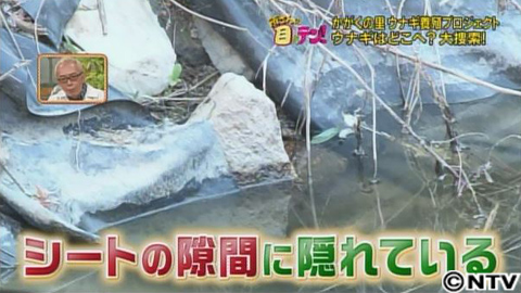 そして迎えた2019年3月。千葉先生は、池の中でまだ探していない「ある場所」にウナギがいるはずだと言い出しました。それは、池の水が地面に吸い込まれないよう、底に張ってある防水シートの隙間。元々、この池は農業用水のため作られたもので、シートもツギハギで隙間があります。先生はウナギがこの隙間の裏に隠れていると言うんです。