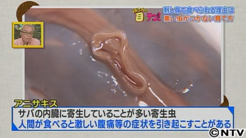 アニサキスは、サバの内臓に寄生することが多く、ヒトの胃に入ると、激痛を引き起こします。