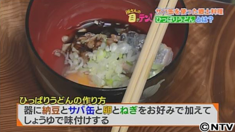 市内のお宅にお邪魔し、作る所を見せてもらいました。まず出てきたのは、かなり大きい鍋。そこに、たっぷりの乾麺を投入。ゆであがりを待つ間に、タレをつくります。基本食材は、納豆とサバ缶と卵とネギ。この地域は、冬は雪深く、昔は雪が降ると買い物にも行けなかったため、ひっぱりうどんの材料には、家に常に置いてある食材や保存のきくサバ缶、そして乾麺が使われています。これらの具材を、それぞれ、お好みの量お椀に入れて、しょう油をかけます。