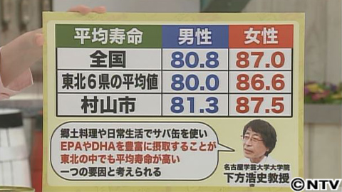また、長寿について研究している下方教授によると、東北地方全体では、塩分の取りすぎやお酒をよく飲むこと、寒さなどから平均寿命が短い傾向があるのですが、村山市は全国の平均寿命を上回っている、比較的長寿の街なんです。郷土料理や日常生活でサバ缶を良く食べて、EPAやDHAをたくさん体に取り入れていることが、東北の中でも平均寿命が高い一つの要因ではないかと考えられるようです。