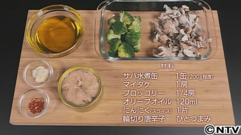 作り方はとっても簡単。ガラス製の耐熱容器に水煮缶を汁ごと入れて、サバの身を軽くほぐします。そこに、一口大にカットしたマイタケ、ブロッコリーを乗せ、オリーブオイルをたっぷり入れます。スライスしたニンニクと輪切り唐辛子を散らして、ふんわりラップをかけて600Wで4分加熱すれば、完成!