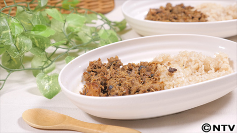 カレーなのにレンジだけで簡単に作れます!耐熱容器にサバの味噌煮缶・合いびき肉・カレー粉・醤油・塩コショウ加え、ざっくり混ぜます。ラップをかけ、600Wのレンジで5分加熱。器に盛った玄米ごはんの上にかけたら、もう完成!