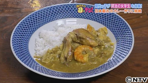 都丸さん、触りたくないので、蛙をまな板を使って鍋に入れ、カレー粉を投入。1時間ほど煮込み、塩で味付けをして小麦粉でとろみを付けたら・・・明治時代のカレーが完成!