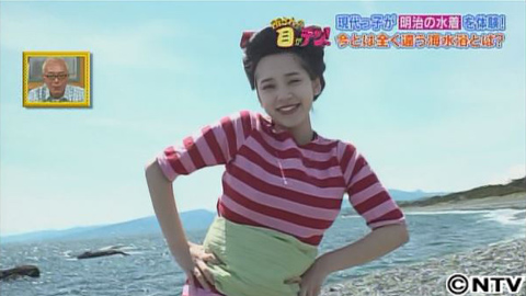 続いては明治時代に始まったレジャーに挑戦するために、神奈川県大磯にある照ヶ崎海岸へやってきました。大磯は、日本の海水浴場として初めて作られた場所なんです。実は、江戸時代には今でいう海水浴のようなものは全く無く、明治に入ってから海水浴というものが始まったのです。当時の人たちは、海水浴の時にどのような服装をしていたのでしょうか。明治後期、女性たちの間で流行ったのは、西洋の影響を受けた縞模様の水着。グラビアアイドルとして、流行最先端の水着をセクシーに着こなす都丸さん。当時の「シマウマ水着」を再現したものに着替えてみました。