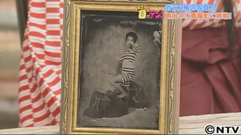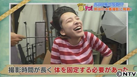 いよいよ撮影。湿板写真はガラス板に薬品を塗ったものがフィルム代わりです。ガラスに光が当たると化学反応を起こし、ガラスに像が映し出されるんです。そして、20秒間、明治時代の写真と同じポーズで静止してなんとか撮影終了。スタジオで完成したものを見ると、見事な写真に仕上がっていました!