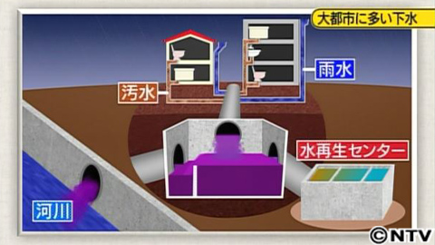 大都市の下水は生活排水も雨水も同じ管の中を流れ、弱い雨の時はすべての水を水再生センターで浄化するようにしています。しかし、強い雨が降ると、街を浸水から守るために、汚水混じりの雨が川に流れ出る仕組みが設けてあるんです。