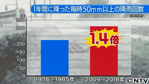 森田教授によると、この仕組みは5年に1回の大雨、量で言うと1時間に50ミリぐらいの雨には耐えられるそう。ちなみにバケツをひっくり返した時の雨は、20ミリぐらい。少なくとも東京都では100年前から下水道整備を進めてきています。ところが、全国のアメダスから集計した1時間当たり50ミリ以上の豪雨の発生回数は、40年前とここ10年を比べてみると、1.4倍に増加。