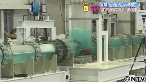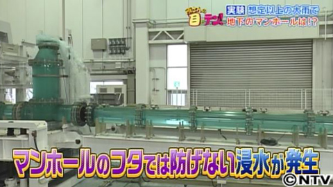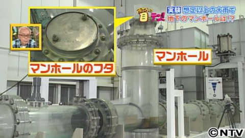 では、これが実物大になるとどうなるのか?まずは旧型のフタで実験です。ポンプでマンホールの下に水を送り、大雨の状態にします。