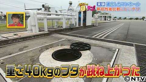 すると!安全のためフタが飛ばないようになっているものの重さ40kgの鉄ぶたがものすごい勢いで跳ね上がりました。
