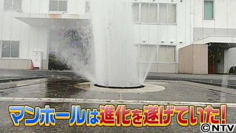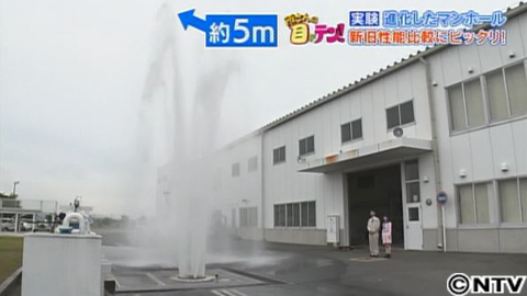 新型マンホールで同じ実験をしてみます。すると、マンホールの蓋はガタガタと大きな音を立て始めした。この音が鳴ったのは空気を徐々に逃がすための仕組み。その後、5m程度、水が吹き上がりました。しかし、肝心のフタは外れていません。