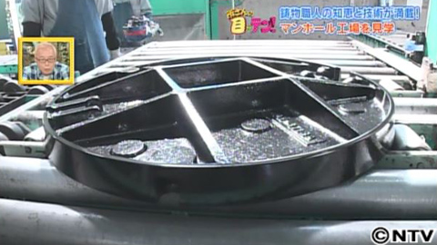 そして、先ほどの溶けた鉄の登場です。昔はすべて職人さんによる手作業で行われていました。現在この工場では主に熟練職人の動きをトレースする機械が鉄を砂型に流し込みます。そして、およそ2時間後、鉄が固まり次の工程へ。崩された砂から姿を現したのは、大まかに形づくられたマンホールのフタ。その後、バリ取りや、精密加工、塗装などの工程を経て完成です!