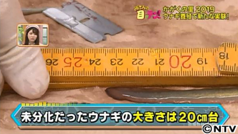 このウナギの正体は、2018年に放流した里ウナギと同時期に育ったものの中でも成長が遅かった群れ。里に放さず、大学で稚魚から1年育てていたそうです。結構大きく育ったように見えますが、まだほとんどの個体がオスメスに分かれていないのだそう。実は去年の実験で、千葉先生が最も驚いたデータがありました。それは、捕まえた29匹中、性別がまだ分かれていないウナギが17匹もいたことだったんです。性別が分かれていなかったウナギは、全て大きさが20センチ台で、千葉先生が思っていたよりも性の分化が遅かったんです。