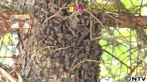 すると西野さん、彼らを一網打尽にして、里にとどまってもらう方法があると言います。一体どうするのかというと、蜂の群れに霧吹きをかけ、飛べなくしてから手掴みで捕まえるのだそう。西野さん、さくさく木に登り、霧吹きで蜂の団子に水をかけ始めました。羽が濡れて蜂たちがおとなしくなったところで、蜂の団子に手を突っ込みました!蜂の塊を手で袋の中へどんどん入れていきます!
