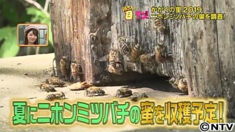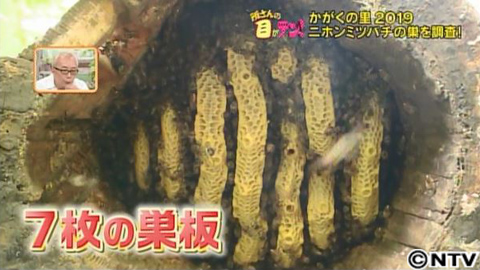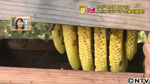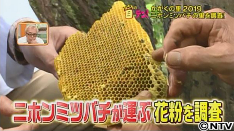 この巣がちゃんと機能していることがわかりました。小野先生は、研究用に1枚巣板を採取。取ってもすぐに巣板は修復されるそうです。さらに、蜜の入った巣板を阿部さんに食べさせてくれました。味はというと…花粉が入っていて、花の香りもする、ハチミツとはまた違った甘さ、だそう。この巣板を持ち帰り、花粉の形態を調べることで、ニホンミツバチがどんな花の花粉を運んでいるかなどが分かるのだそうです。