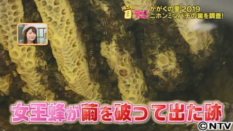 巣は順調に大きくなっているようです。さらに、小野先生が見せてくれたのが、女王蜂を育てるために作られる、王椀(おうわん)という穴。この王椀をいくつか作り、その中で女王蜂が卵を産んで、いい蜂が残っていくのだそう。そして、王台(おうだい)と言われる穴は選ばれた新女王蜂が育った穴。茶色くなっているのは繭が破けた跡で、女王蜂がもう出た証拠なんです。