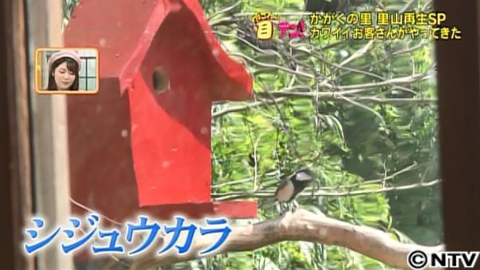 5月中旬、去年、間伐材を使って建てたあの小屋で、嬉しいサプライズが!お馴染み、里山のスーパーマン西野さんが、小屋の赤い巣箱に、鳥が出入りしていると言うんです。そこで、小屋の中からカメラで観察してみると…本当に来ました!黒いネクタイ柄のシジュウカラという野鳥です。
