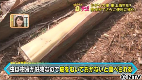 今は、木が水を一番吸い上げている時期なので、皮をむくと、びちょびちょに濡れています。この状態で、使えるようになるまで、およそ3週間待ちます。翌日、西野さんは再び裏山へ。枯れたクリの木を使って、また何か作るみたいです。枯れていたら、中が腐ったりしていそうなものですが、実はクリはとても腐りにくい木。なので、家の土台や線路の枕木に使われてきたそうです。腐りにくい理由は、カビを防ぐタンニンという成分があるから。クリはタンニンをとても多く含んでいるのだそう。