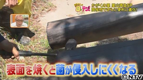 そして、5月下旬。ヒノキの乾燥が終わり、いよいよ作業スペース造り開始!まず、西野さんが持ち出したのは、ガスバーナー。そして、柱にするヒノキを焼き始めました!焼くのは、土に埋めて固定する柱の根元だけ。なぜ焼くのでしょう?木を腐らせるのは木材腐朽菌という菌。土に埋める部分は、土の湿り気で腐朽菌が繁殖しやすいんです。こうして表面を焼いておくと、菌が侵入しにくくなるんだそう。