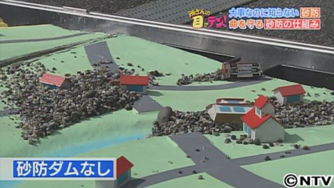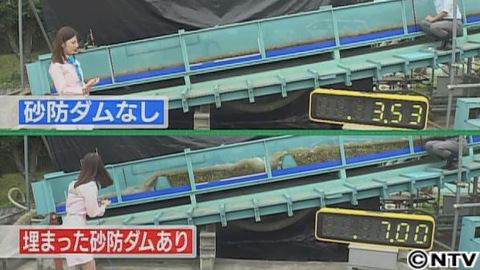 日本各地で土石流を防ぐ砂防ダム。一体どんな効果があるか、川と町のモデルを使い、実験してみました。砂防ダムなどが整備されていない場所に土石流を模した石と水を流してみると、土石流がさえぎられることなく流れていき、人々が生活している地域を襲います。