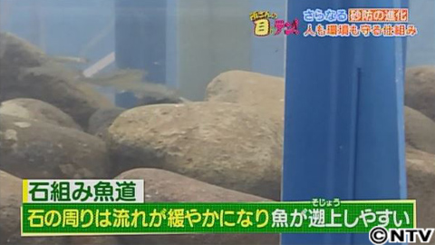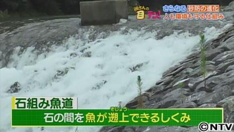 砂防ダムの新しい進化は、魚などの生き物のためのもの。そこで造られたのが、魚の通り道となる「魚道」。