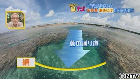 船に乗り込み、いざ出発!漁を行うポイントは30か所近くあり、福地さんは長年の経験から、その日の天候や海の状況に合わせて選んでいるといいます。裕太さん、最初は見学させてもらうことに。まず福地さんは、網を手にして海の中へ。そして、ポイントについたところで、水深6メートルの場所に手際よく、網を広げていきます。実は、この網を仕掛ける場所が重要なんです。網を設置する場所は、サンゴ礁とサンゴ礁の間。この水路が、魚の通り道になっているのです。