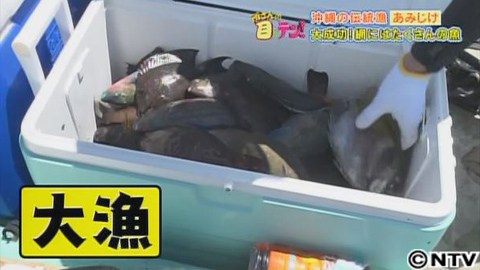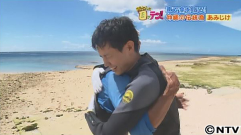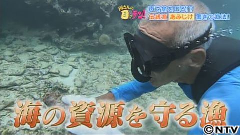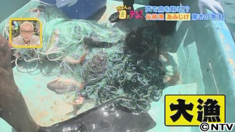 気を取り直して、再挑戦!果たしてうまくいくのか?先ほど同様、海底まで一気に潜りますが、今度は海底でうまく石を拾うことができませんでした。それでも、そのまま続行!「ウォ!ウォ!」と、大きな声を出して、魚を追い込んでいきます!すると…魚が網の方へ!裕太さん、さらに最後の一押しで声を出します!すると、追い込まれていた魚が一気に網に引っ掛かりました!これには、裕太さんもご満悦!網には、たくさんの魚が掛かり、見事大成功!