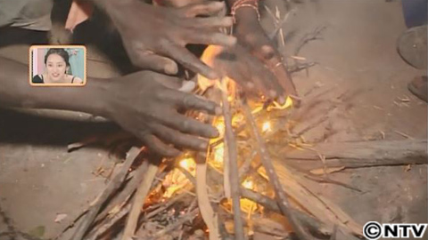 朝6時。自分で作った家で熟睡する金丸さんが起床する時間です。家の外に出ると、この集落のリーダー、ハントラさんたちが、すでに焚火にあたっていました。タンザニアの朝は肌寒く、気温は15℃。ハントラさんが岩場に登り、集落の人たちに向けて大声で「早く起きろ!焚き火をしてるから来い!狩りに行くぞ!」と呼びかけます。これで目が覚めたのか、男性たちが続々と焚き火に集まってきました。焚き火で体を温める男性ハッザ。皮膚が強いのか、焚き火に直接手を当てても平気なようです。