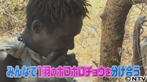 一方、金丸さんは獲物を探し、走っていました。また何かを見つけたのか、急に走りだしたハッザ。金丸さん、その速さに全くついていけず。ようやく追いついた頃には、すでにホロホロチョウというキジ科の鳥を捕まえていました。またしても狩りの瞬間には間に合いませんでしたが、実はこの時、事前にハッザの男性に目線カメラを装着していたんです。そこには、獲物を捕らえた決定的瞬間が映っていました!鳴き声を頼りに獲物を探し、木の上にホロホロチョウを見つけたハッザ。弓を構え、一発で射抜きます。木から落ち、なおも逃げるホロホロチョウ。それを狩猟犬が追いかけ、捕まえます。