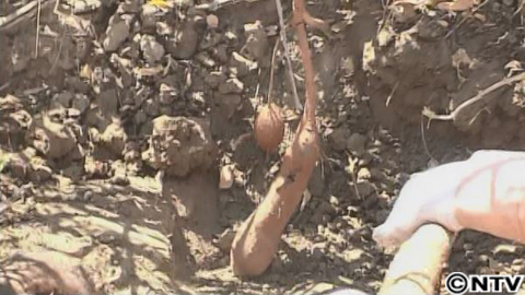 一方、都丸さんは、ハッザの女性たちとともに木の実やイモを採りにいきます。食材集めは、ハッザの女性の日課。歩くこと10分。シュムコというイモが埋まっている場所を見つけました。シュムコはツル植物の仲間。他の木にツルを巻き付けながら伸びるため、つるを目印にたどっていくと、地中のイモを見つけられます。さっそくイモ掘り開始!乾いた土を掘っていくと、天然のイモ、シュムコが顔を出しました。