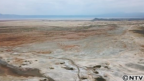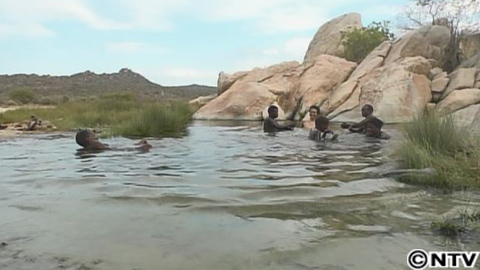 エヤシ湖は、炭酸ナトリウムを多く含んだ湖のため、周囲に草木が生えず、地平線が一望できる絶景が広がっています。湖岸を進んでいくと…そこには、ハッザおすすめの湖岸に湧き出る温泉が!早速ハントラさんが温泉へ豪快にダイブ!金丸さんも狩りの汗を流します。ハッザは毎日、お風呂に入る習慣はありませんが、時々、ここに来て体を洗っているそうです。のんびり温泉につかっていると…突然、ハッザの1人が助走をつけて走りだし、そのまま温泉にダイブ!みんな、テンションが上がってはしゃいでいます。金丸さんもハッザに煽られ、温泉ダイブに挑戦!見事なダイブを決め、みんなを笑顔にすることができました!温泉で裸の付き合い。ハッザの一員になったような気分の金丸さんでした。