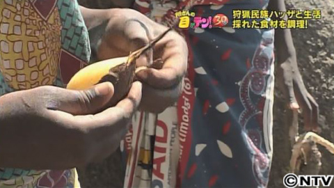 都丸さんも焼きたてを食べてみると…ジャガイモのようにしっかりとしたイモの味が感じられ、とても美味しかったそうです。木の実は周りのゴミを取り除いてから、煮込んでエキスを取り出します。煮込んでいる間、都丸さんは、ハッザの女性たちと女子会トーク!ハントラさんの奥さんのエスティアーコさんにお付き合いをしたきっかけを聞いてみると、照れながら馴れ初めを語ってくれました。ハントラさんとエスティアーコさんの出会いは、藪の中。ハントラさんの一目惚れだったのだとか。結婚する時は、ハチミツとヒヒを持ってきてプロポーズをされたのだそう。そんな独特な恋愛話に花を咲かせていると、木の実が煮込み終わり、エキスだけを取り出していきます。見た目は泥のような色ですが、都丸さんがウガリにつけて食べてみると、実がより甘くなり、美味しく食べられました!採ってきた食材をみんなで食べる所を見ていると、都丸さんも感慨深くなります。しかし、都丸さんは翌日から重大な使命があるため、ここでハッザ生活終了。寂しさも残しつつ、都丸さんは別のミッションへ向かうことになりました。