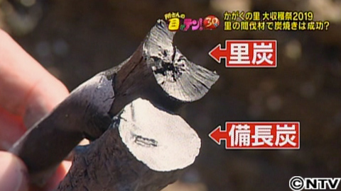 出来た炭を見てみると、見た目は中途半端な感じ。そこで高木さんが普段使っている備長炭と比べてみることに!すると、里の炭にも、備長炭と同じような光沢が。