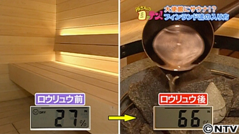 ロウリュウをすることで、27%だった湿度が66%まで上がりました。ロウリュウの熱い蒸気によって体感温度が上がり汗をかきやすくなるんです。